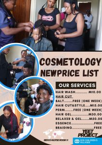 Over the past 8 months of learning, Cosmetology YEET participants are proud to announce the hair services they provide for all people in Leribe. Visit them at Hlotse, Bedco Room 11 to see for yourself. and remember that all services BRAIDING & ESSENCE ARE FOR FREE you only pay M10.00 for a hair wash. HURRY!!! This week we also do PERM & HAIR CUT FOR FREE!!
